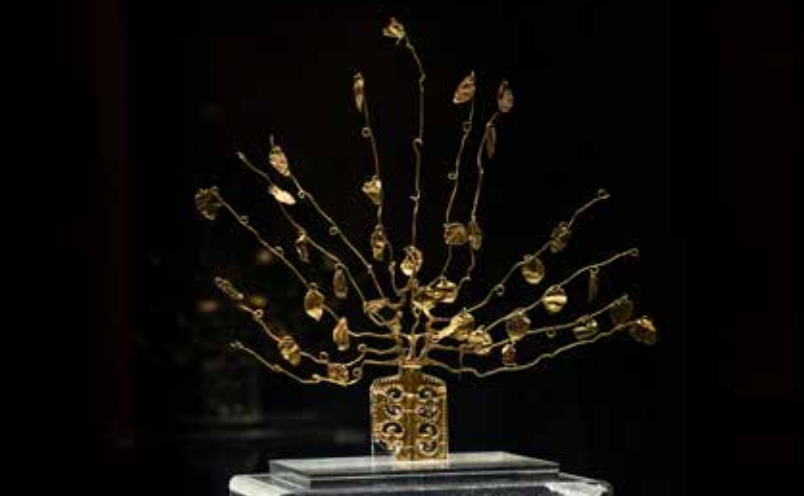 花树状金饰,三国、北朝时期,高27.3厘米,现藏辽宁省博物馆。该金饰整体如扇状花树,设计精巧,为鲜卑贵族头饰。吐谷浑先人可以追溯至居于辽东的慕容鲜卑,后于西晋时期西迁