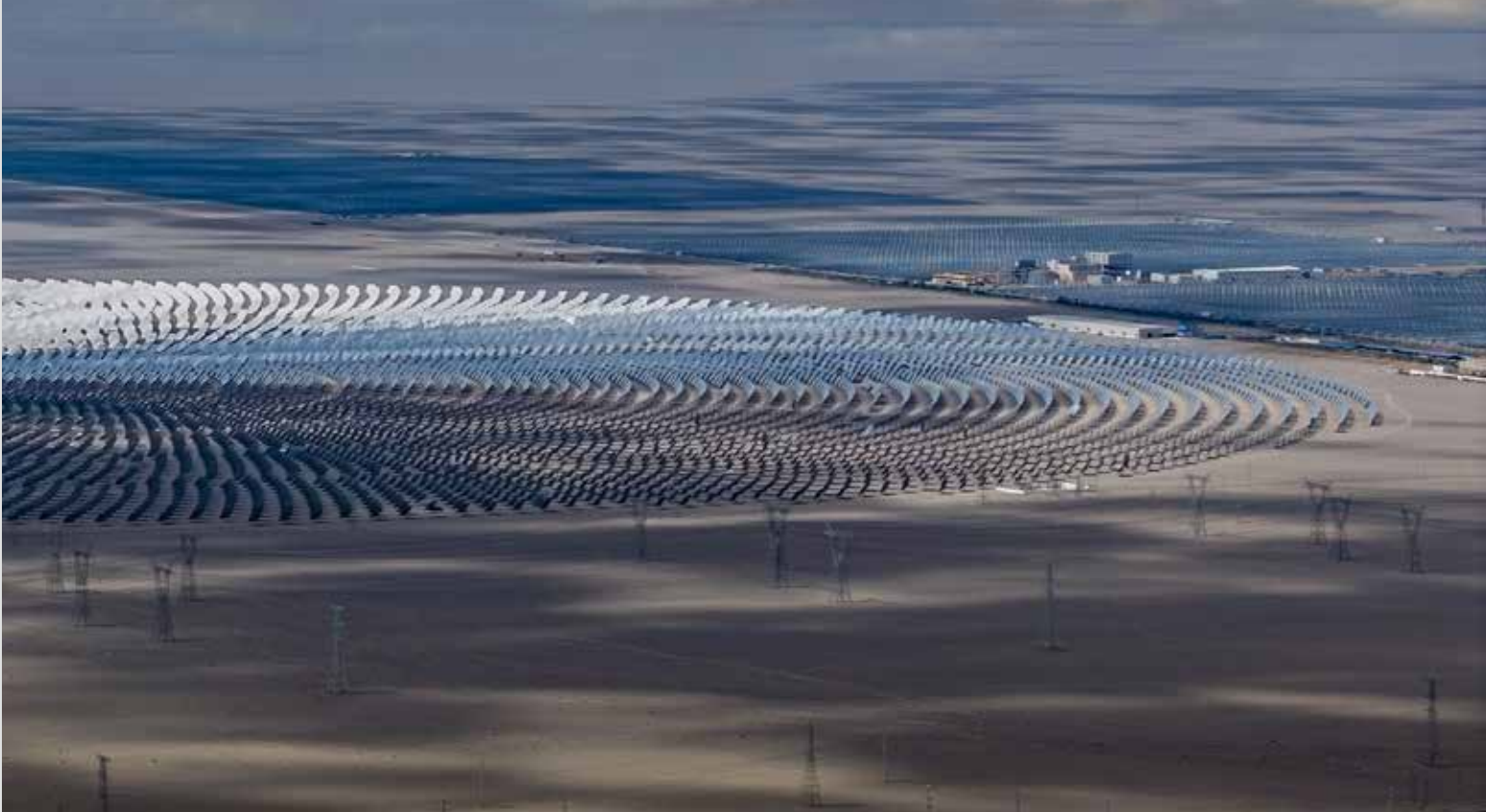 德令哈市光伏光热基地的塔式熔盐光热电站,位于青海海西蒙古族藏族自治州。呈圆周排列的定日镜环绕着吸热塔,光热电站是高效利用太阳能的系统之一