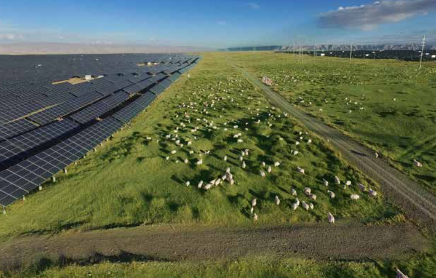 值得一提的是,随着光伏板的铺设,当地生态也渐渐改善。荒滩治沙的根本是挡风、涵土,光伏板大面积铺开后,仿佛为塔拉滩披上了一件“风衣”,可以起到挡风作用,不仅有效降低了地面风速,也减少了土壤的水分蒸发,为植被的生长创造了有利条件。在青海省林草局的支持下,园区还修建了防沙固林带,不仅园区内各类苗木成活率达到90%以上,原生植物覆盖面积也大幅提升。“蓝海”之下渐渐长起绿色的草场,当地牧户的羊群被引进入园“打卡上班”,是园区内的自动“除草机”,羊粪又成为肥料滋养土壤使其肥力得到改善。为了让羊能够畅通无阻地食草又不影响光伏板安全,园区开展了光伏支架型式的研究,将光伏组件的离地间隙从原来的50厘米抬升至120厘米,拓宽了羊群的“绿色通道”,实现了“板上发电、板下牧羊”。如今,“光伏羊”结伴成群地走入光伏板阵列中悠闲地吃草散步也成为塔拉滩光伏产业园的标志性场景。当地村民除了在园区当“光伏羊倌”,还能通过清洗光伏组件、割草、货物搬运等方式拓宽收入渠道,“上电下牧”的模式也实现了清洁能源、生态修复、民生创收的多赢局面。