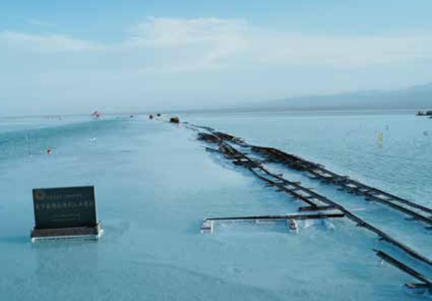 位于察尔汗盐湖的青海盐湖钾肥股份有限公司钾肥生产基地。目之所及的笔直的白色路面即盐桥规则的盐池是生产光卤石的盐田