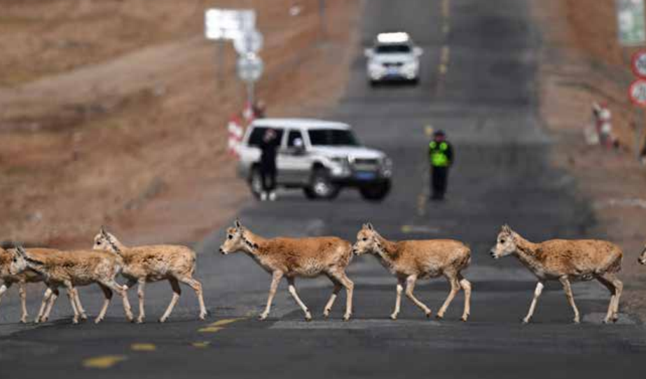 2023年5月28日,在青海可可西里,一群雌性待产藏羚羊通过青藏公路。青藏公路是藏羚羊迁徙的重要通道,每年5月至7月,为保障藏羚羊安全通行,当地实施交通管制、全链条巡护等措施,并建立应急救助机制